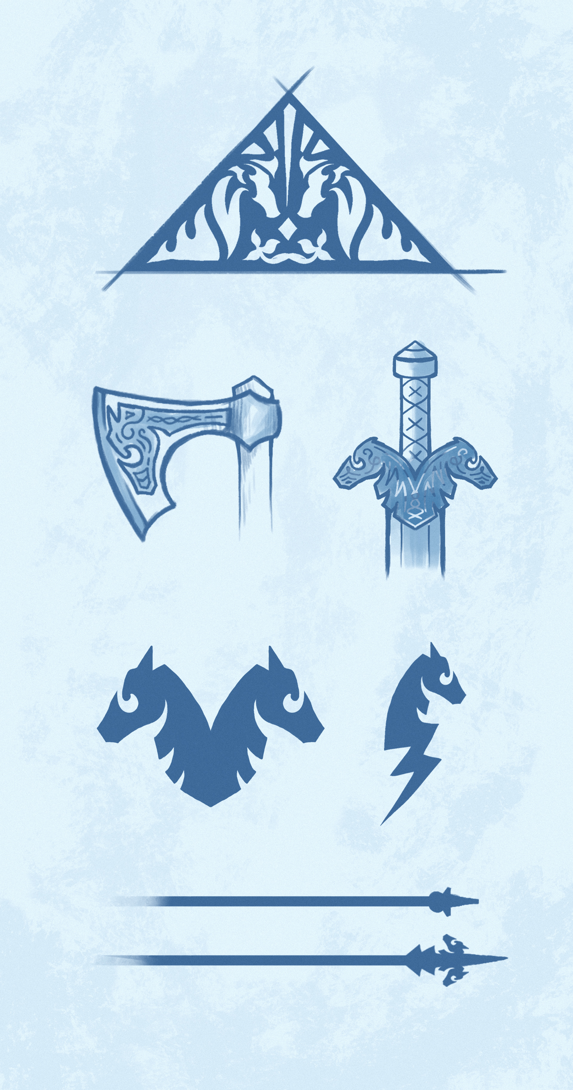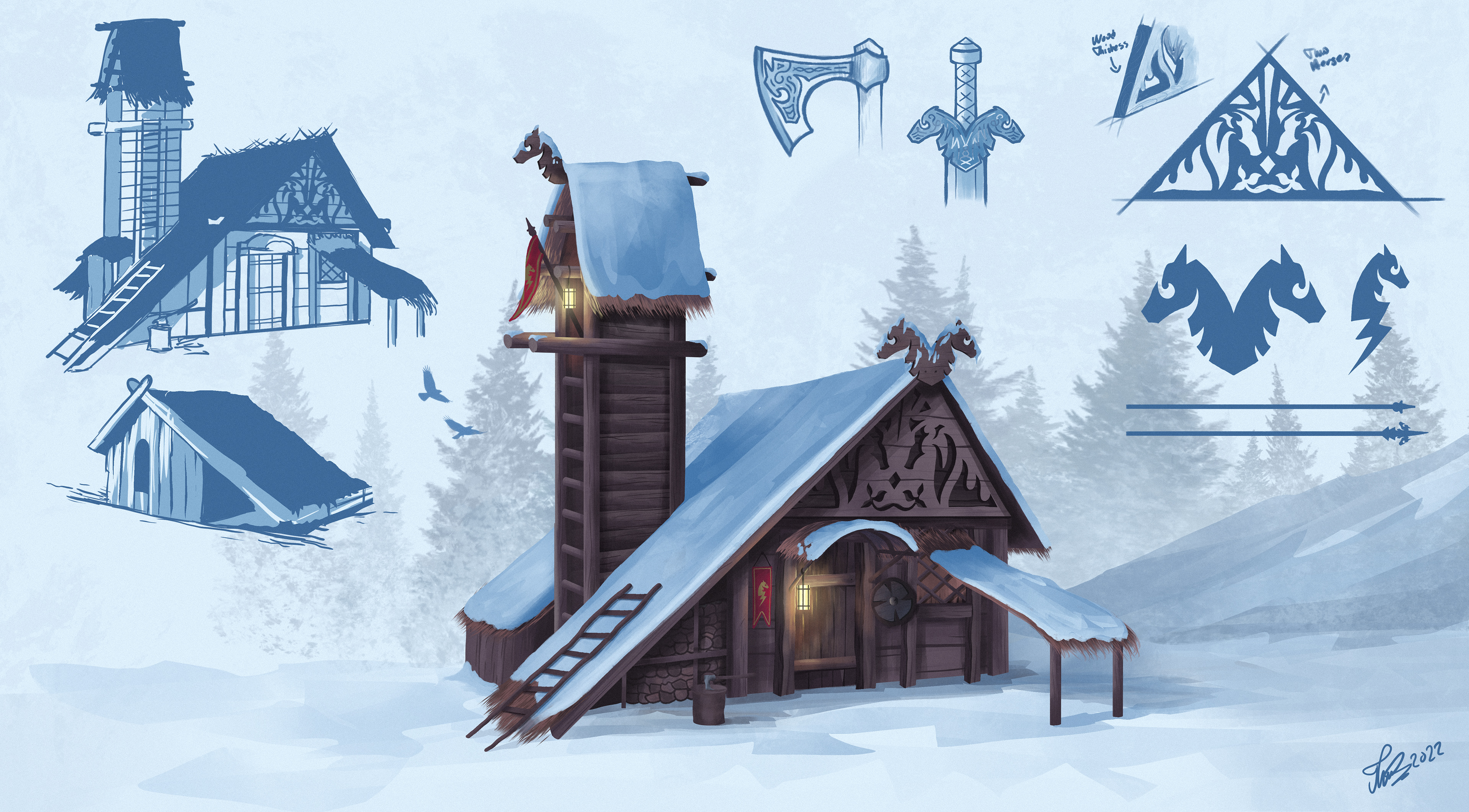 Viking style house of an old king who's whole people were killed and now lives alone, in this modest hall. I love branding and that's why I continued with a whole identity for the kingdom with logos and weapons.